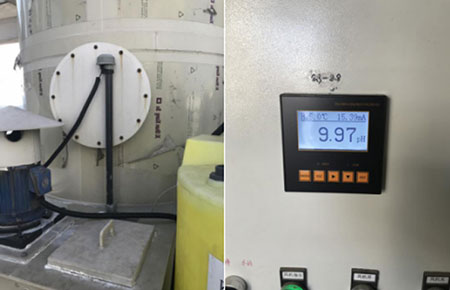 在本次工程中,聯測的在線pH計應用于廢氣噴淋塔處理環節中,主要是應用在堿液循環裝置上,通過監控pH和ORP值,控制在線加藥,測量吸收廢液中氫氧化鈉和次氯酸鈉的的含量,并設置報警值,控制蠕動泵進行加料,保證廢氣噴淋效果達到預期目的。