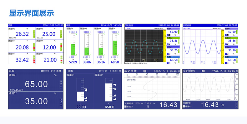 無(wú)紙記錄儀是將采集的數(shù)據(jù)/運(yùn)算數(shù)據(jù)以時(shí)間為基軸記錄在儀器內(nèi)部的存儲(chǔ)系統(tǒng)中,無(wú)消耗任何常用的記錄設(shè)施,如:紙張、筆墨。記錄在儀器內(nèi)部的存儲(chǔ)數(shù)據(jù),通過(guò)運(yùn)算、模擬后顯示在液晶屏。常用顯示用液晶屏比較廣泛。在液晶屏屏幕上,可以顯示數(shù)字顯示、棒圖顯示、曲線顯示、報(bào)警列表等。無(wú)紙記錄儀采集的數(shù)據(jù),常用的有:溫度、壓力、流量、液位、電壓、電流、濕度、頻率、振動(dòng)、轉(zhuǎn)速等。